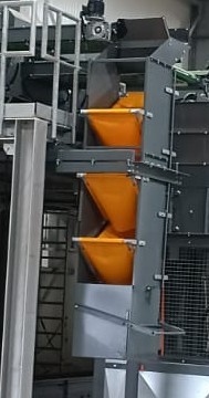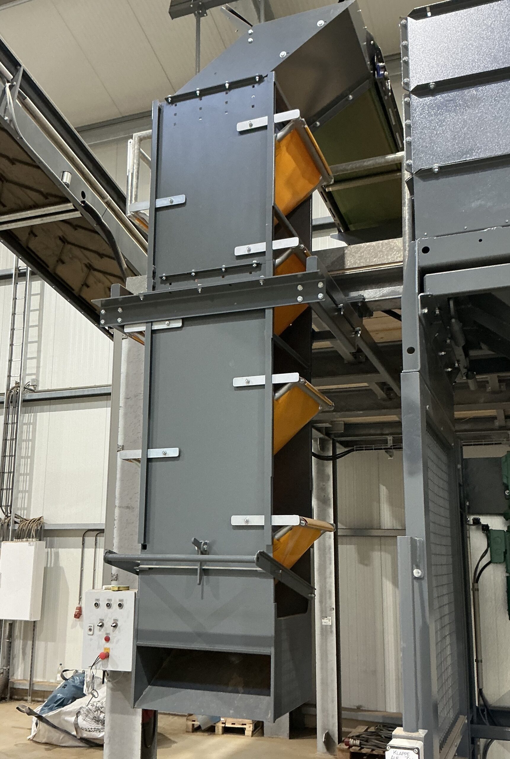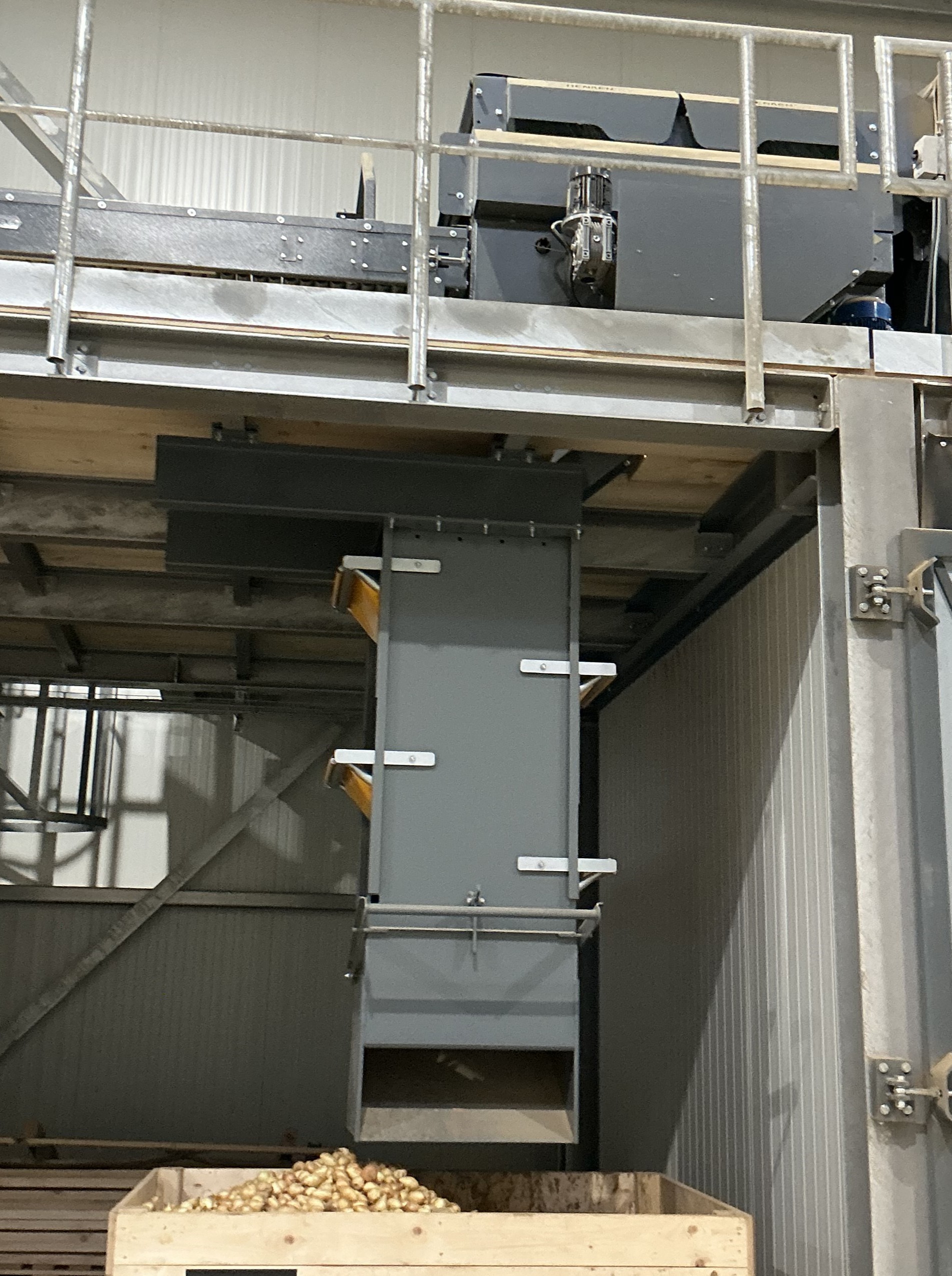 Installation zum schonenden herabführen des Produktes (Kartoffeln, Zwiebeln) mit gleichzeitiger Pufferung als Staubehälter.