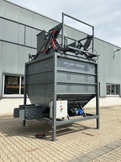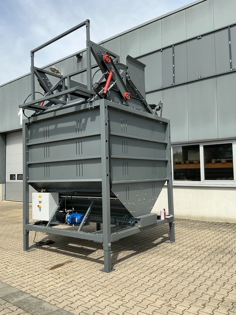 Sehr schonendes und leistungsfähiges Kistenkippgerät für Großkisten bis 2 t Inhalt. Durch den separat zu schließenden Deckel wird der Beschleunigung des Produktes entgegengewirkt. Die flache Bauweise macht die ebenerdige Beschickung und Entnahme möglich. Die Ausführung ist variabel und kann auf die Großkisten angepasst werden.